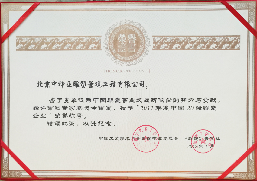 中神亞雕塑企業始建于1986年,(期前身為溫嶺藝術雕刻廠北京分廠)是設計和制作不銹鋼,鈦金屬,鍛銅,鑄銅,石刻等室內外雕塑的專業企業。是中央美術學院雕塑系和清華大學美術學院雕塑系實習創作基地,亦是中國美術家協會雕塑藝術委員會和中國工藝美術學會雕塑專業委員會特別推薦企業;是全國雕塑企業委員會副主任委員單位;是中國雕塑學會理事會員單位;2010年增選為中國建設文化藝術協會環境藝術專業委員會常務理事單位;2011年批準加入為中國建筑金屬結構協會會員,2012年增選為中國建筑金屬結構協會第十屆理事會理事單位;中國鋼結構協會團體會員;是具備住建部核準可承擔各種類型藝術鋼結構、藝術網架結構工程三級資質企業...