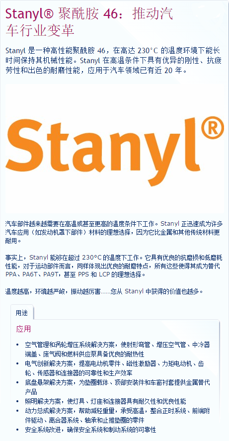 在易于加工設計方面,Stanyl具有與高溫樹脂,如LCP,PPS和PEEK具有相同的性能。