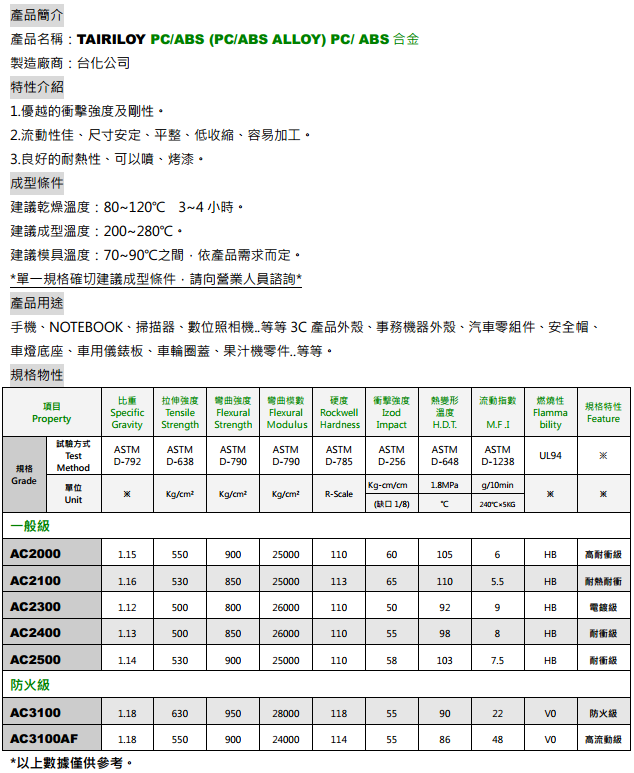 PC/ABS | AC2000 | 超高耐衝擊性、高耐熱性、 一般成型 | 手機外殼、汽車零組件、安全帽、車燈底座、注射針筒外殼、電子類塑膠元件 |